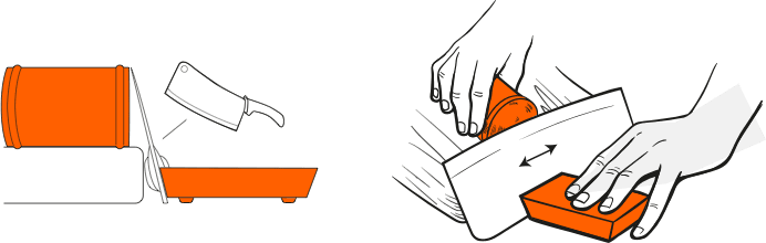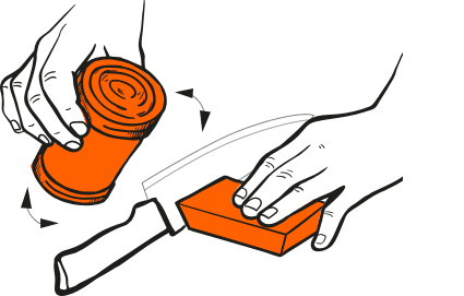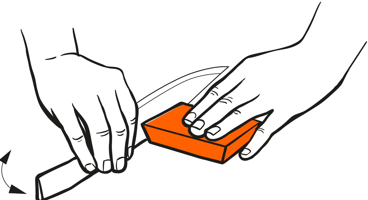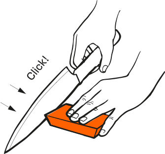 Use uma leve quantidade de pressão! Afia em uma superfície estável, como um balcão de cozinha ou tábua de corte. Para facas mais altas apoiar o Afiador Canth com uma tábua de corte para que o apontador é elevado ao nível da borda de corte.